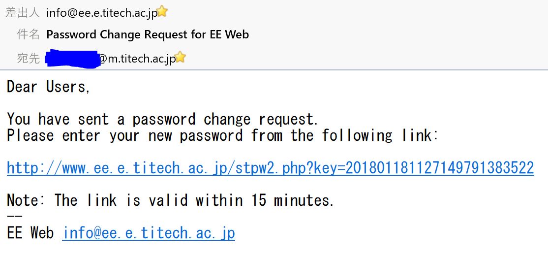 下記の手順でパスワードを設定/変更してください。大学院新入生で初めてパスワードを設定するときは,コース主任から連絡のあったURLを使ってください。それ以外の学生は,問題があれば,info@ee.e.titech.ac.jpへ連絡してください。